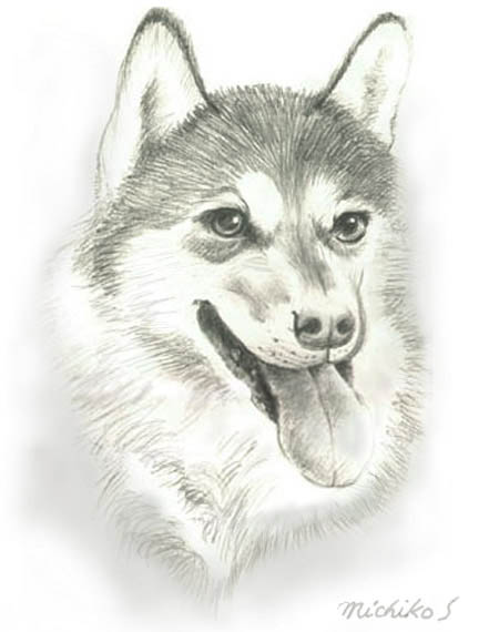 犬さんの絵を描くのも嫌いではありません。ただ、モデルがカレンダーの犬とか、本に載っていた犬 とかで…、つまり公開する事が出来ないだけだったりします。 (そんな絵でも見たいと言う方は直接メールでお問い合わせください…笑) 今回の絵は題名の通りハスキー犬のつもりなのですが、ちょっと鼻が短いですよね(うーむ反省)。